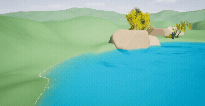 In addition, because the waterfall’s flow is more turbulent, the contact waves where the main waterfall material meets the shoreline geometry are denser in color and use finer noise compared to those in the lake.